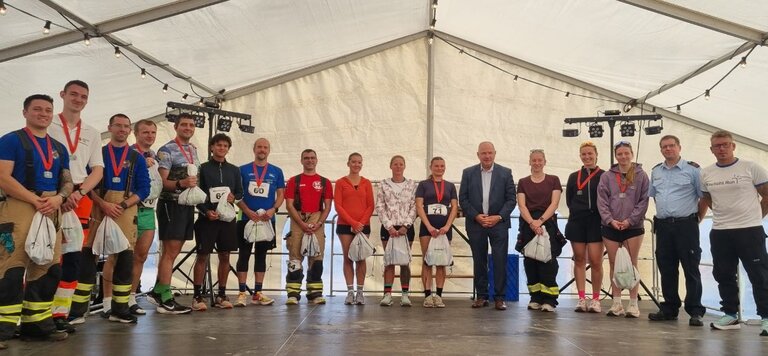 Bild: Teilnehmerinnen und Teilnehmer des BlaulichtRun 2025 in Rheindürkheim: Gemeinsam mit Unterstützern und Organisatoren feierten sie das erfolgreiche Laufevent.